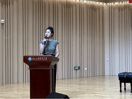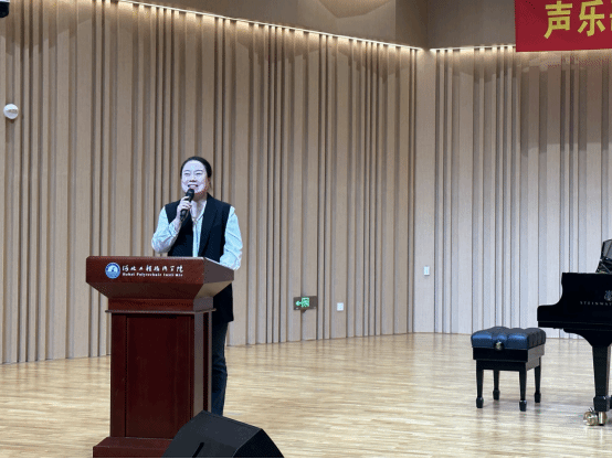 声歌系主任郭艳艳老师,首先对2023级新同学的到来表示热烈欢迎,其次又向各位同学介绍声歌系专任教师、外聘教师,以及器乐系三位艺术指导老师。郭主任在讲话中提到:大学四年的学习生涯,说长也不长,说短可也不短,要同学们把握好自我的人生方向,树立起自我的人生目标并坚持不懈的为之奋斗。郭主任在讲话中对同学们说:“你们中的每一位都是与众不同,这是属于你们的时代,所以你们尽情的去奋斗,尽情的去拼搏,我们要有河工闯创容融的大学精神,牢记修德凝道的校训,期望四年后的你们,收到一份满意的人生答卷。新征程上,广大青年学生要坚持把报效祖国作为最大追求,把服务人民作为最大责任,把奉献社会作为最大价值,在勤学苦读和实践中厚积薄发,真正成为时代的骄子、栋梁之才,担负起时代赋予的神圣使命,用青春汗水和智慧书写人生最美的篇章,将所学知识回报社会,为实现中华民族伟大复兴中国梦不懈奋斗,贡献自己的一份力量。”
