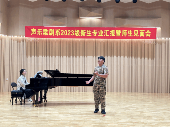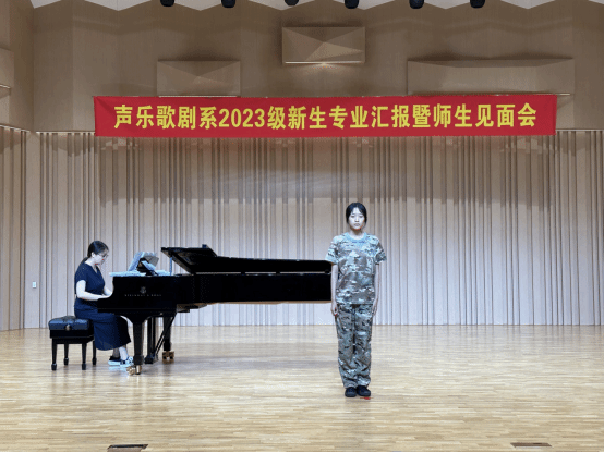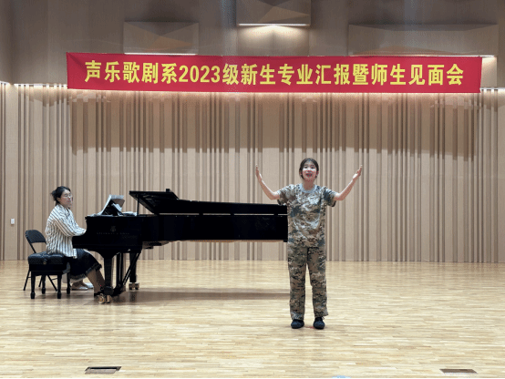 2023级音乐表演专业(声乐方向)新生专业汇报暨师生见面会,于2023年9月15日下午17:00在音乐厅举行。本次汇报由声歌系姜莎老师主持,全体专任教师参加。本次共109名同学进行专业汇报,在汇报前,声乐歌剧系主任郭艳艳、教师代表靳菲分别进行了讲话,对2023级新同学的到来表示热烈的欢迎并给予最大的期许。