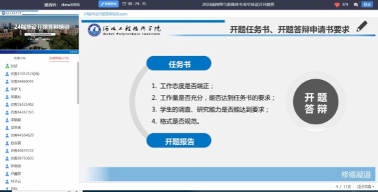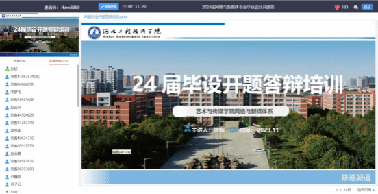 为提高学院毕业生质量,进一步落实网络与新媒体专业应用型人才培养计划,2023年11月26日晚8点30分,艺术与传媒学院组织网络与新媒体系师生在超星智慧平台开展2024届网络与新媒体系本科毕业生毕业设计开题说明会,网络与新媒体系主任孙妍及毕业设计指导教师、2020级网络与新媒体专业全体学生参会。