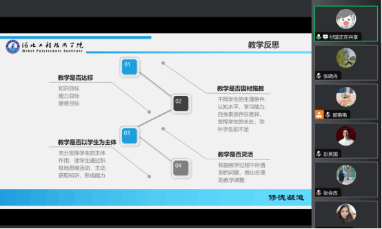 本次新学期教学活动共分为新教师说课及老教师经验分享两项内容。新教师张文博、张晓舟、李嘉慧、魏佳进行新学期课程教学说课;老教师李缘梦、安鑫、付璇、靳菲对于多年的教学经历进行说课及经验分享。在说课环节,老师们分别在学情分析、教育理念与目标、课程思政、过程与方法、考核与反馈等方面进行阐述。