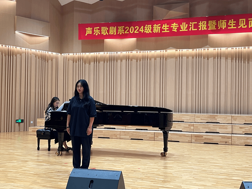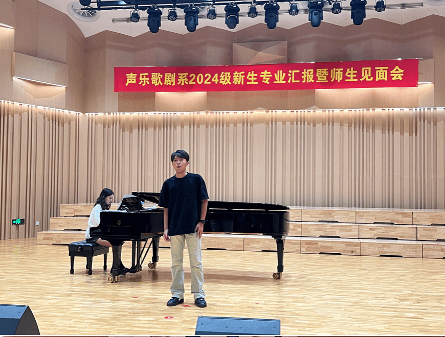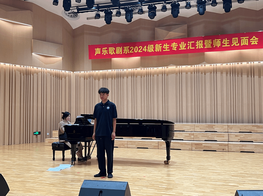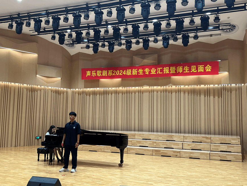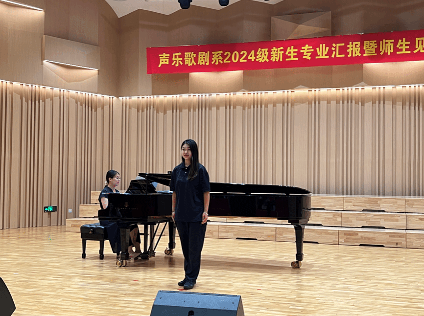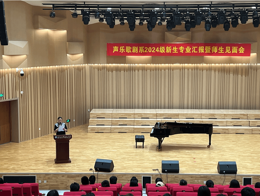 2024级音乐表演专业(声乐方向)新生专业汇报暨师生见面会,于2024年9月18日下午18:00在音乐厅举行。本次汇报由声歌系副主任姜莎主持,全体专任教师参加。本次共有106名同学进行专业汇报,在汇报前,声乐歌剧系主任郭艳艳、教师代表靳菲分别进行了讲话,对2024级新同学的到来表示热烈的欢迎和最诚挚的期许。