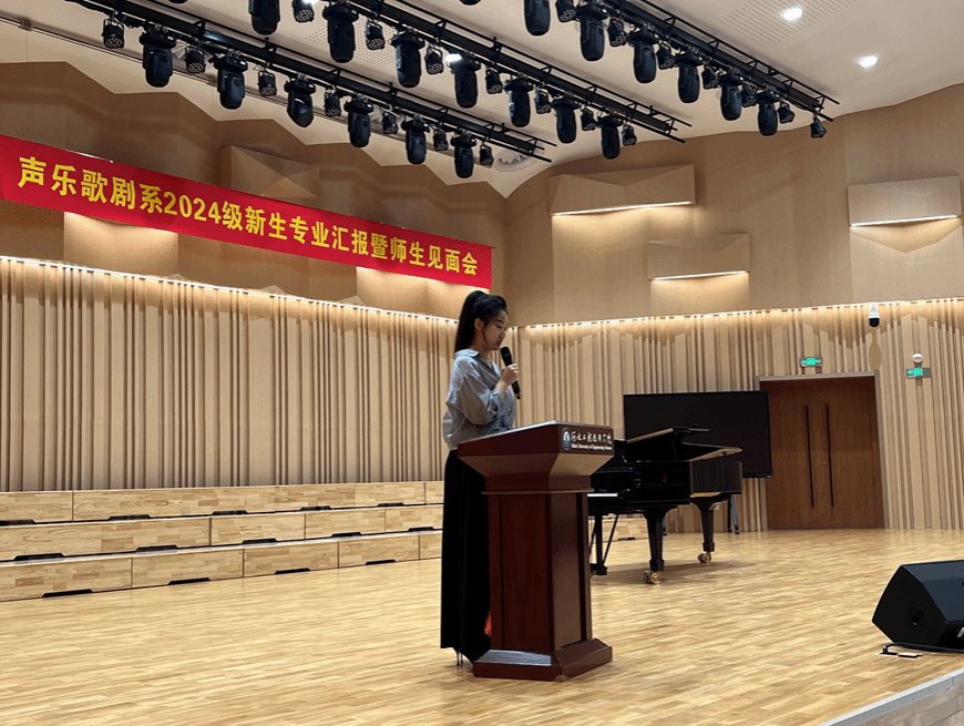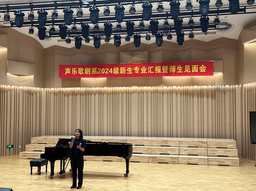 声歌系主任郭艳艳老师,首先对加入声乐歌剧系的2024级新同学表示祝贺与欢迎,随后向各位同学介绍各位声歌系专任教师、外聘教师。郭主任在讲话中提到:希望在座的每一位同学都不要荒废青春时光,要让大学生活充实而有意义,在这完美的青春时光里顽强奋斗,让自我的梦想在这里启航,让自我的青春美丽绽放。此外,郭主任还对同学们殷切叮嘱,希望同学们有“闯、创、容、融”的大学精神,牢记“修德凝道”的校训,广大青年同学要志存高远,坚定树立对马克思主义的信仰,对中国特色社会主义的信仰,补足精神之钙,筑牢思想根基,坚定不移听党话,感恩党,跟党走。人民有信仰,民族有希望,青年有担当,国家有力量。最后,郭主任还提到,在“九·一八”事变纪念日这样特殊的日子里,我们要以史为鉴,珍爱和平。愿每一位青年同学都怀抱着自己的理想,在人生的航程上不断乘风破浪,奋勇前进,真正成为时代的骄子,栋梁之才,肩负起时代复兴的神圣使命,用青春和汗水书写人生最美的篇章,将所学知识回报社会,为实现中华民族伟大复兴的中国梦不懈奋斗,贡献自己的一份力量。