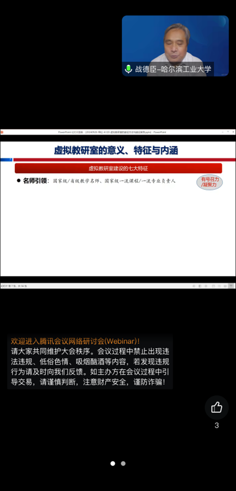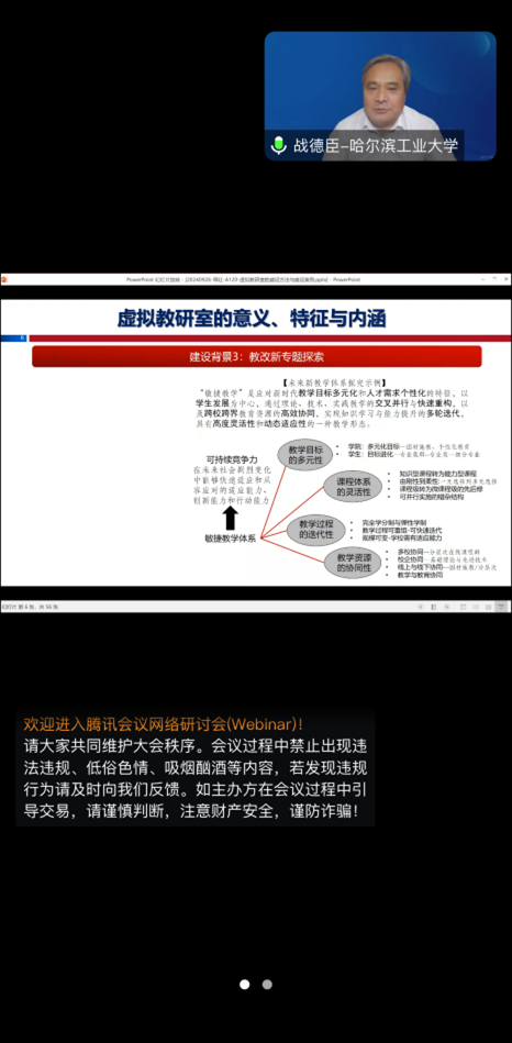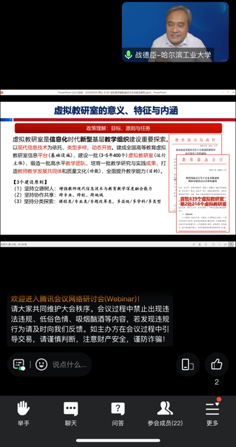 9月28日,研讨会的焦点转向了虚拟教研室的建设。哈尔滨工业大学教授战德臣作为该领域的权威专家,为参会者带来了题为“虚拟教研室的建设方法与建设案例”的专题讲座。战德臣教授结合哈尔滨工业大学的实践经验,详细讲解了虚拟教研室的建设背景、目标、方法以及取得的成效。他强调,虚拟教研室是新时代背景下高校教学组织创新的重要方向,对于提升教学质量、促进学术交流具有重要意义。战教授的演讲内容丰富、观点新颖,引发了与会者的广泛讨论和深入思考。