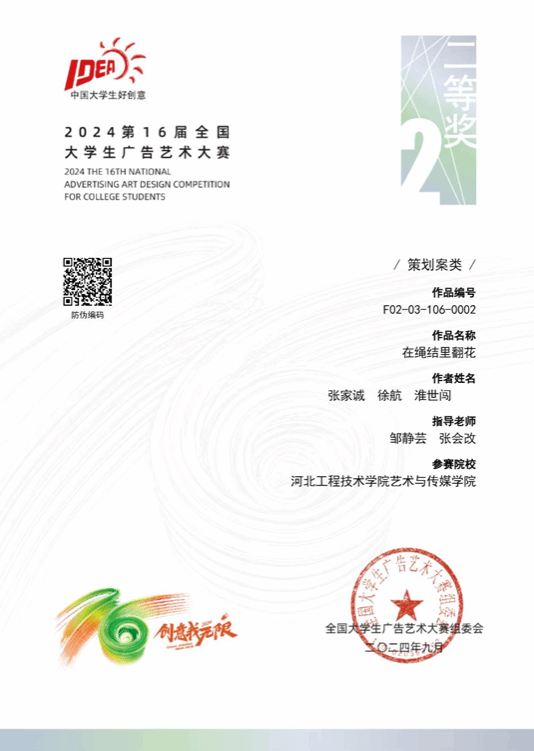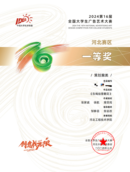 本次赛事一经发出,学院积极组织相关专业师生共同参与,经过充分的市场调研后得出广告主题,在教师的悉心指导下,高质量完成策划作品。经过激烈角逐,我校荣获河北赛区一等奖2项,三等奖2项。其中,营销策划作品《在绳结里翻花》通过校赛、省赛及国赛的层层选拔,最终获得国家级二等奖的可喜成绩,实现学校在本赛事的又一跨越。