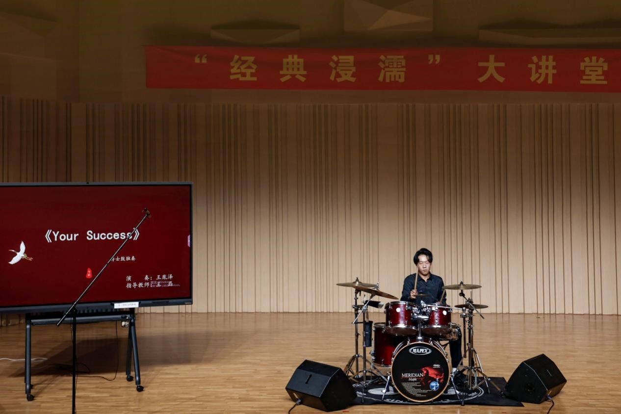 爵士鼓曲目《Your Success》 对于演奏者在机能、动态处理和时值的把握上有较高的要求。2024级(器乐方向)1班王胤泽演奏时,情绪推进、细节处理细腻,体现了较为现代派的演奏手法和音乐处理方式。