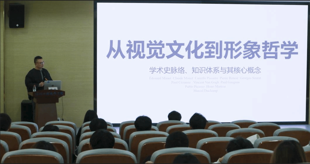 此次讲座由刘毅与张帅两位教授主讲,刘毅,南京大学艺术学院副教授,硕士生导师,艺术史研究所副所长,中华美学学会艺术哲学专委会副秘书长,主持与参与国家社科基金艺术学项目、艺术学重大项目多项,发表学术论文四十余篇。张帅,同济大学设计创意学院副教授,上海社会科学创新基地“创新设计竞争力”副主任。先后入选上海市“晨光计划”,“扬帆计划”等人才计划,同济大学可持续发展与新型城镇化智库研究员。讲座伊始,刘毅教授以其深刻的学术见解开启了“从视觉文化到形象哲学”的探索之旅。他提出,形象不仅仅是视觉的直接对象,更是人类心灵与外部世界交互作用的复杂产物,在哲学层面上,形象关乎存在、意义与价值的构建,其与人类的自我认知、社会建构以及精神追求紧密相连。在讲解过程中,刘毅教授旁征博引,从西方哲学史上对形象的思辨到东方文化语境中形象的独特意蕴,为听众绘制了一幅跨越时空与文化界限的形象哲学宏大画卷,引导大家深入思考形象在人类文化与精神世界中的核心地位与多元意义。