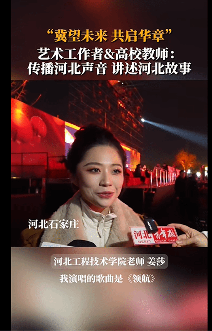 在此次盛会中,艺术与传媒学院声乐歌剧系专任教师姜莎老师受邀参演,以其深情动人的嗓音倾情演绎了歌曲《领航》,赢得了现场观众的热烈掌声。演出结束后,姜莎老师接受了河北青年报记者的专访,感慨道:“作为河北省的一名高校教师,能够在这个平台上传播河北的声音、讲述河北的故事,不仅是我的荣幸,更是我们肩负的责任与使命。”