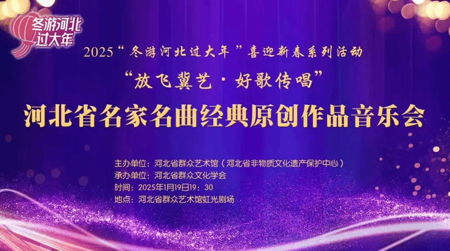 燕赵长歌开启盛世华章,经典旋律赓续千年文脉。为弘扬中华优秀传统文化,集中展示近年来河北省优秀原创音乐作品的丰硕成果,立体化呈现这些经典音乐作品的恒久魅力,在新春佳节来临之际,由河北省群众艺术馆(河北省非物质文化遗产保护中心)主办、河北省群众文化学会承办的2025“冬游河北过大年”喜迎新春系列活动——“放飞冀艺·好歌传唱”河北省名家名曲经典原创作品音乐会于2025年1月19日在省群艺馆虹光剧场精彩上演。