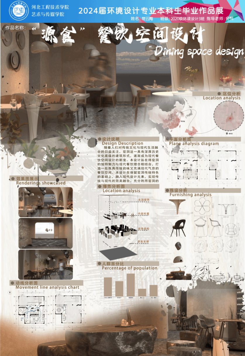 本设计以陕西窑洞为文化载体,探索传统建筑与现代餐饮空间的创新融合。设计聚焦窑洞“拱形结构、生土质感、地坑院落”三大特征,通过解构重组手法构建沉浸式用餐体验:曲面穹顶序列还原窑洞拱券的节奏美感,夯土肌理墙面结合数字化浇筑技术,赋予材料环保性与艺术性。设计以运用本土材料、被动式节能技术及地域符号叙事,打造兼具生态智慧、文化认同与当代美学的餐饮空间,为传统民居活化提供创新范式。
