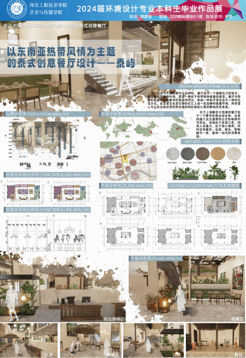 本设计以东南亚热带风情为主题,融合泰式传统建筑元素与现代餐饮空间功能。设计提取泰式坡屋顶、镂空雕花与自然材质,通过层叠式木构架与竹编屏风打造通透灵动的空间界面,营造热带雨林的氛围感。空间采用柚木家具、藤编灯具及香料展示台,强化地域文化特色,同时集成自然通风与遮阳系统,体现生态设计理念。动态光影投射泰式传统图案,结合气味扩散系统,打造视觉、嗅觉与触觉多维沉浸体验,展现热带风情与人文艺术的完美融合。